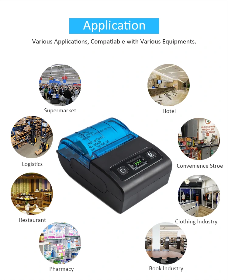 Pencetak terma mudah alih mini mempunyai permintaan yang besar dalam pasaran, terutamanya dalam industri runcit, katering, penghantaran ekspres dan perkhidmatan lain. Contohnya, pencetak jenis ini menawarkan pedagang dan penyedia perkhidmatan penyelesaian pembayaran yang mudah dan cekap. Tanpa memerlukan sambungan berwayar yang kompleks, teknologi Bluetooth membolehkan gandingan pantas dan mudah dengan telefon pintar, tablet atau peranti mudah alih, menjadikan proses pembayaran lebih cepat dan mudah. Dengan reka bentuk mudah alih dan ringan, ia sesuai untuk tempat jualan mudah alih atau senario perkhidmatan.